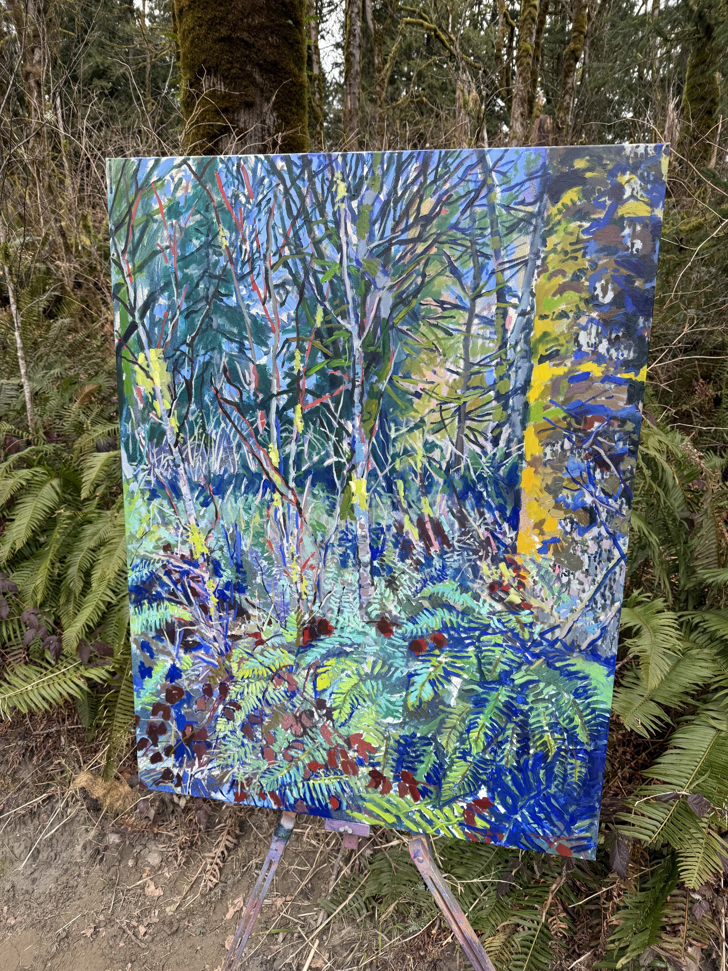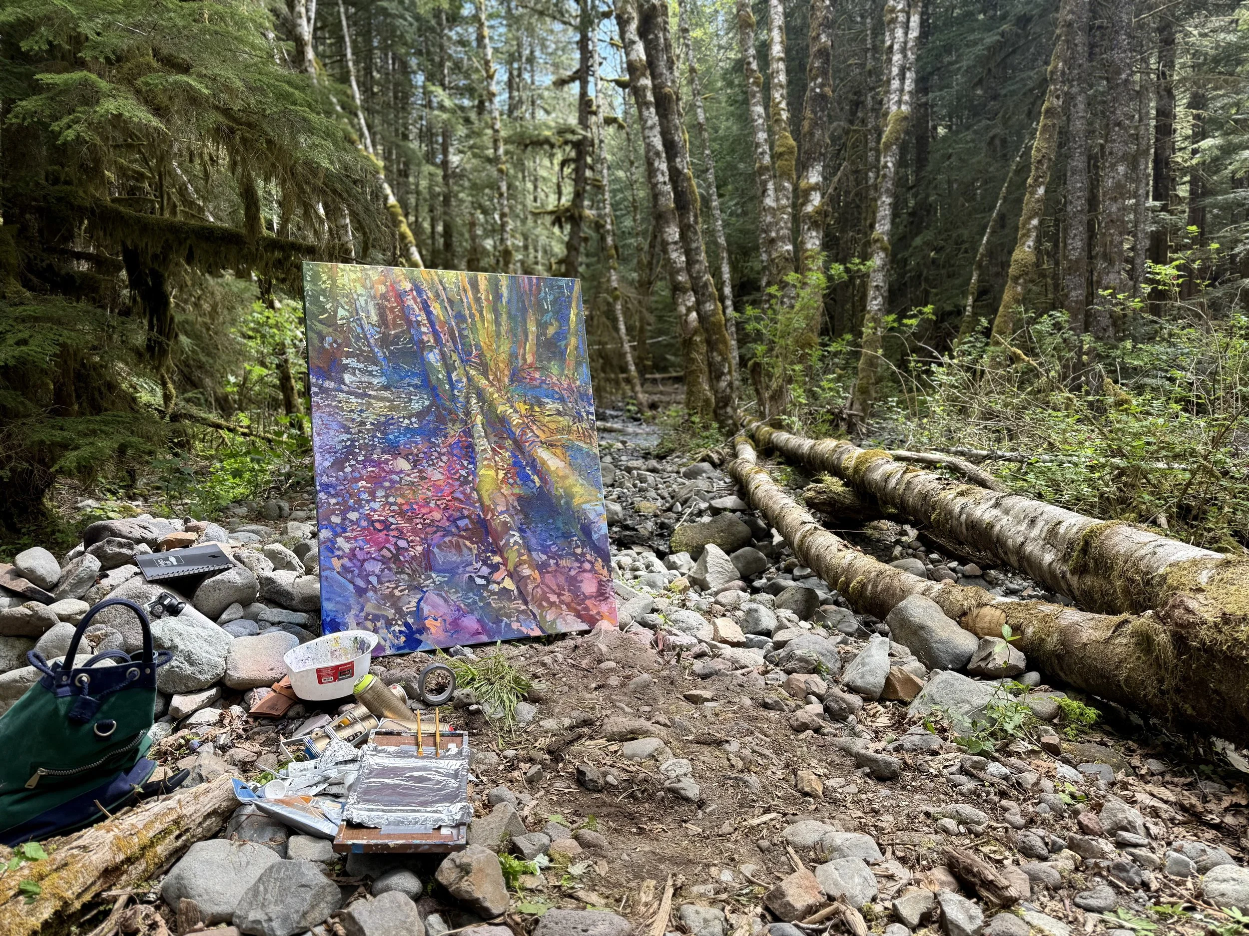 Each canvas is born outdoors, painted on location in the rivers, mountains, and forests of the Pacific Northwest. Living nomadically, I carry my work into these places — camping for days at a time, letting weather, light, and silence push their way into the painting.