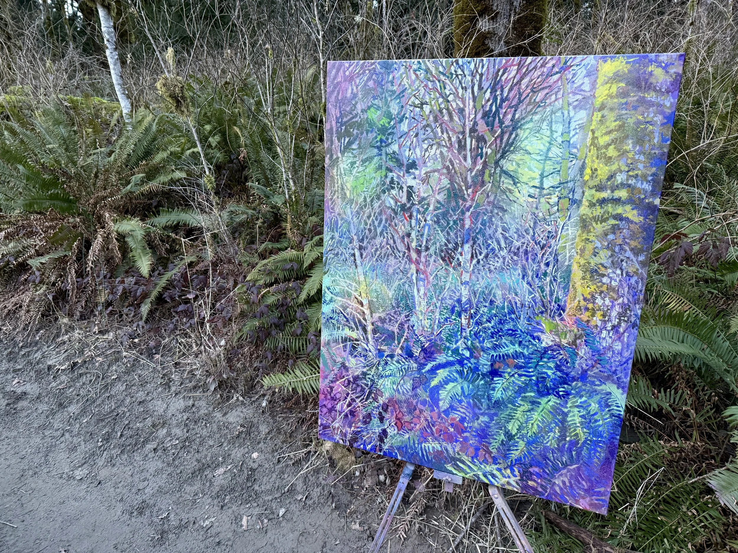 Each canvas is born outdoors, painted on location in the rivers, mountains, and forests of the Pacific Northwest. Living nomadically, I carry my work into these places — camping for days at a time, letting weather, light, and silence push their way into the painting.