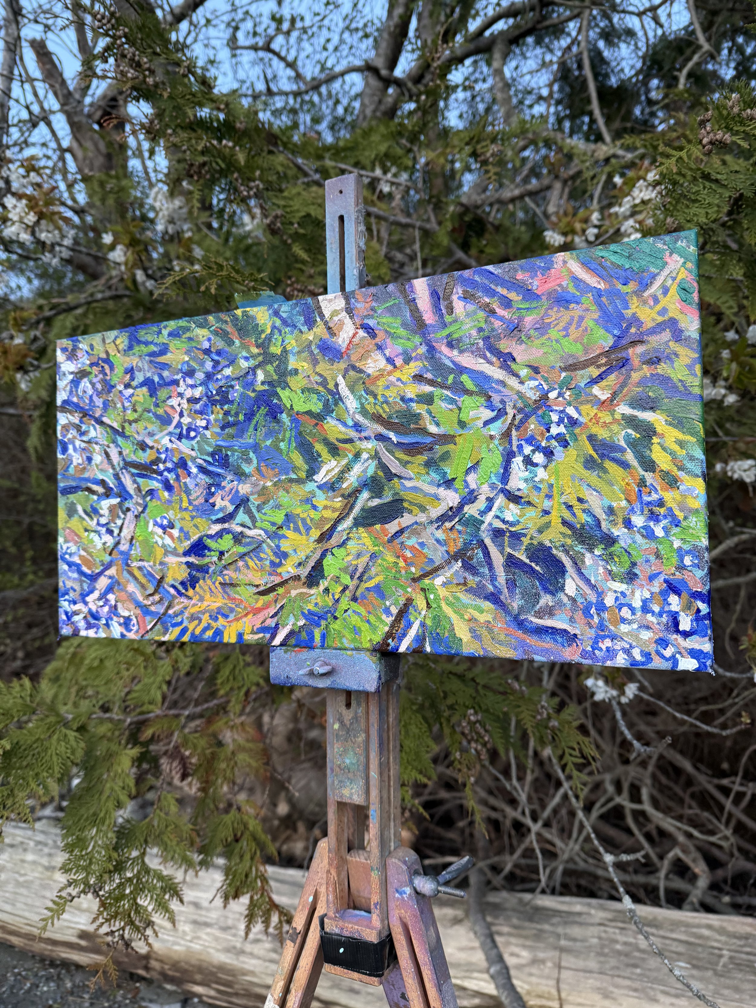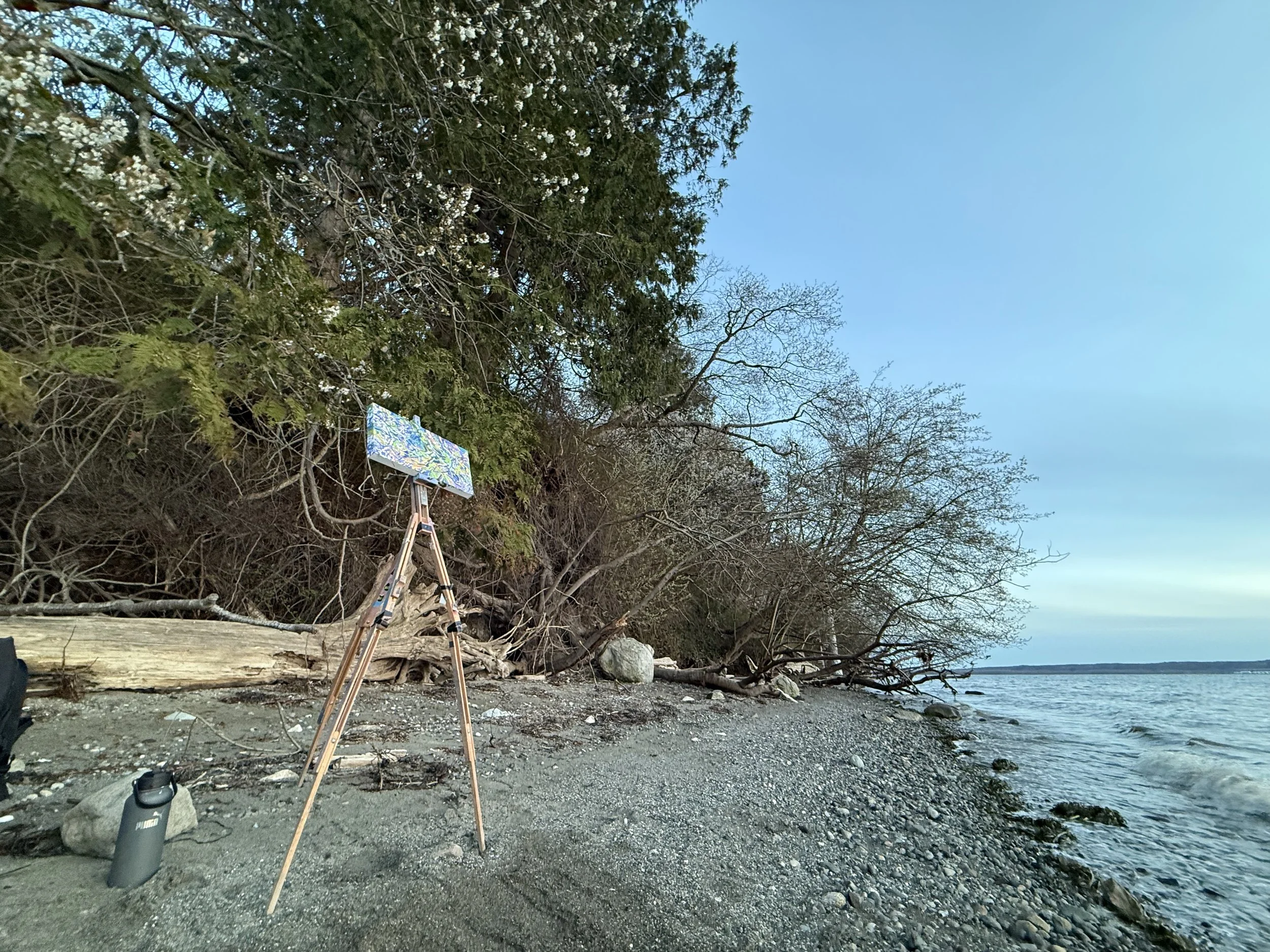 Nature always teaches and in this case it was a lesson in patience. This spot was at the end of a 45 min walk, a last chance attempted walk down at the beach after walking the above trail. This area is pretty unique, the beach and trees smashing together along the cliff edge, allowing a great view at trees and textures looming above and outwards. I’ve been focusing on interwoven textures and plants and this instantly checked that box when I saw it. Compounded with the wind, its expression within the tree and its movement, I was affected by the strong winds, not allowing a relaxed painting session. Maybe it hasn’t been mentioned, but meeting people the energy I get from those interactions is very impactful. Even details as small as where I’m standing and how I’m standing is meaningful. Being on the beach, in loose rock, on a slope meant I was constantly repositioning and moving, but having to take care of that movement as I could trip pretty easy; the tide even came pretty far in towards the end, luckily this one’s all finished regardless.