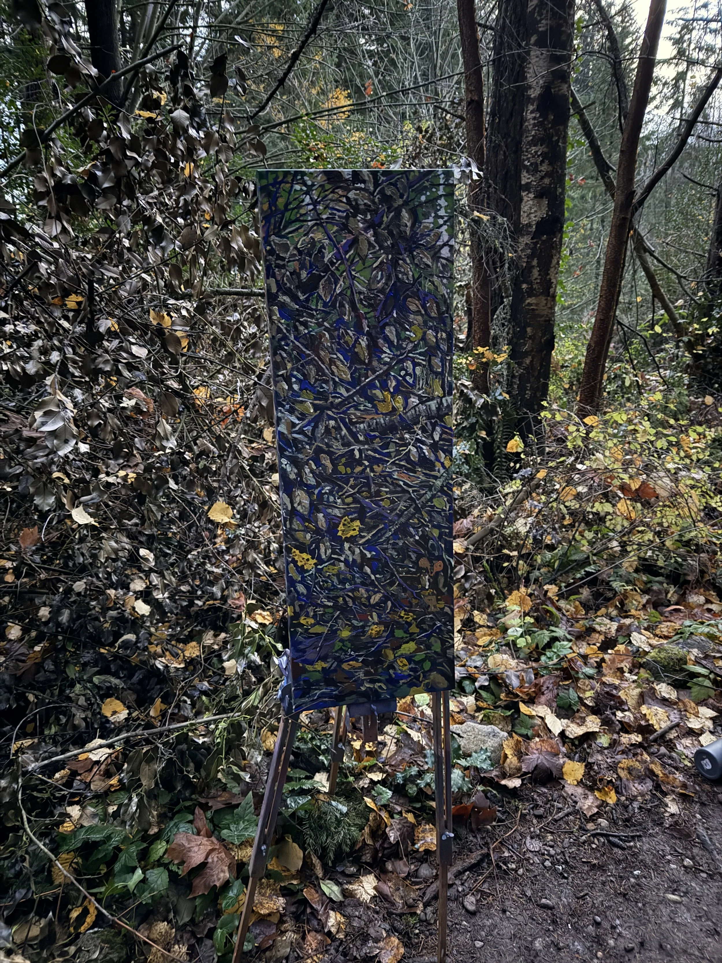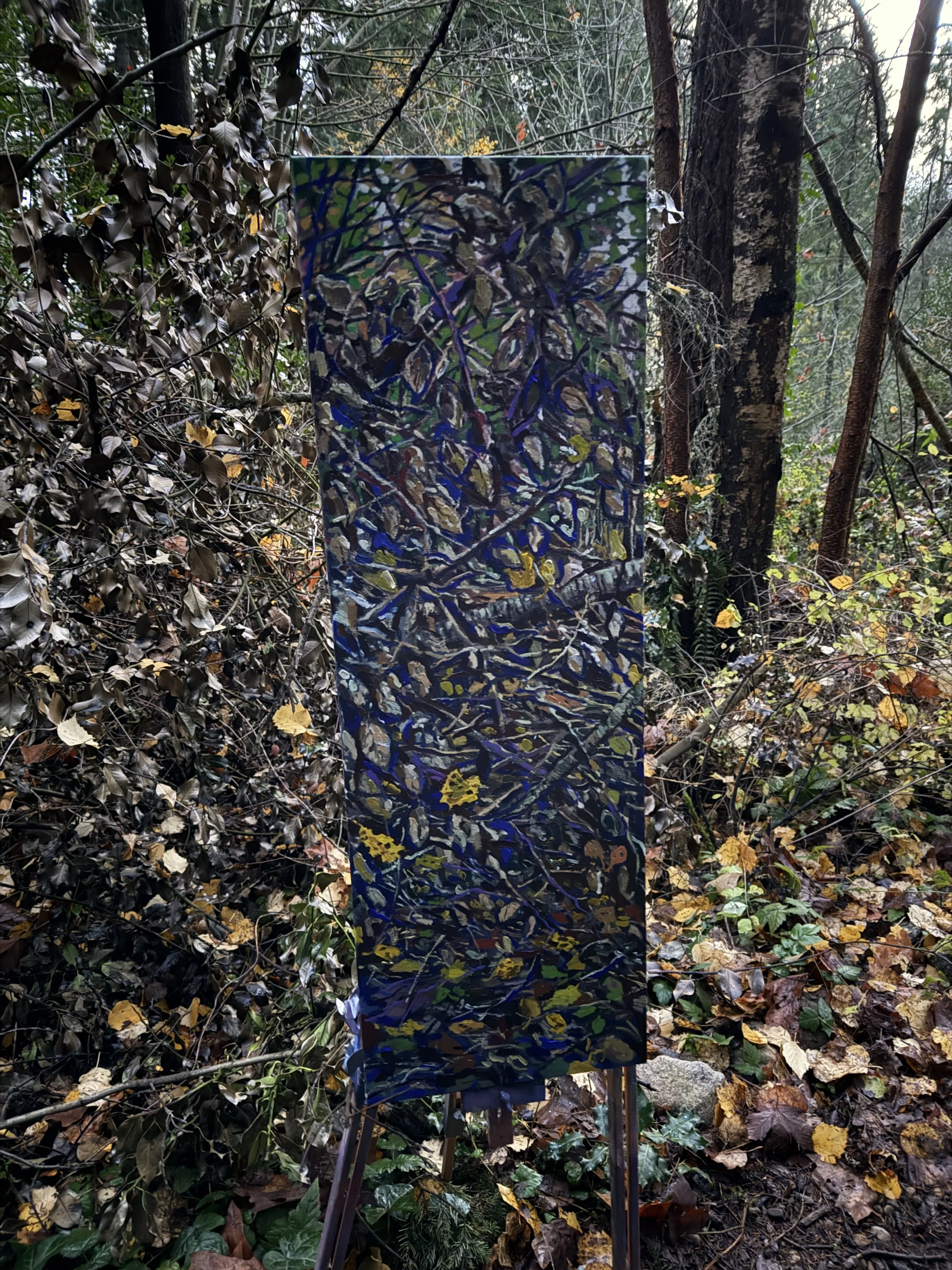 Completed at Rasar State Park over 5 days. This multimedia piece created in acrylic paint and spray paint was aimed at capturing the textures and colors of fall. This subject matter choice and subject decision is a result of being to specific before with prior work. Iād been trying to exclusively paint water, rivers or streams but given the restrictions and availability I decided to paint this tightly packed texture because everything is worth painting, I decided creating work quickly is better then creating the work I think is important. This is a series I will certainly continue through different seasons, finding its easy, it tells a story both of that areas, the season and allows me to play with technique, scale and will be easy to paint in winter.