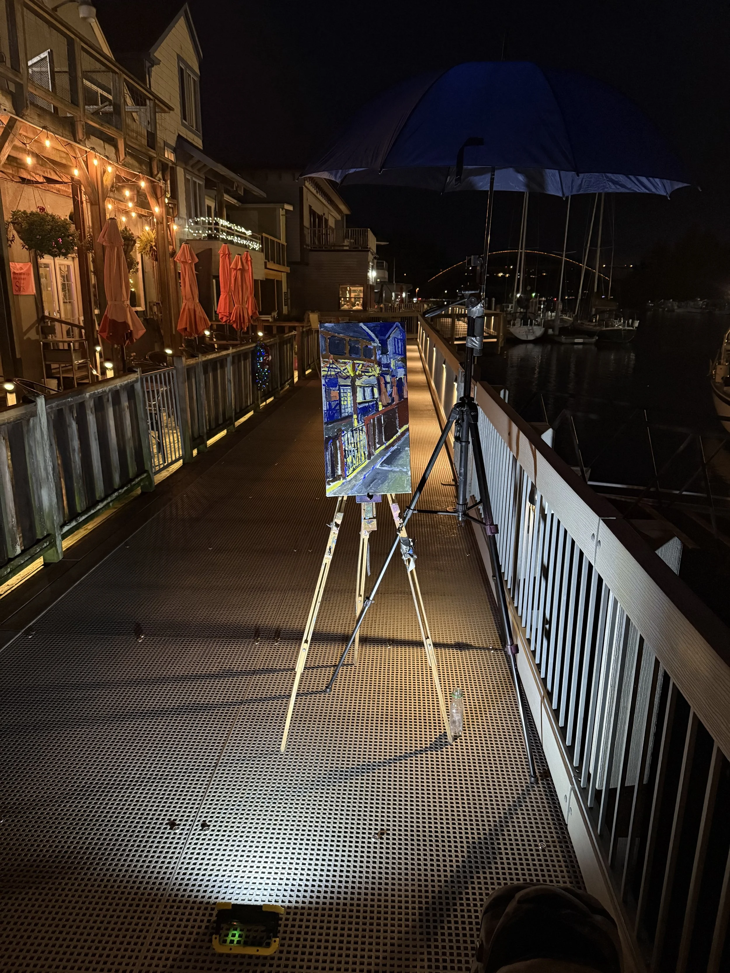 Completed recently in La Conner a night time pleinair, started about 45 min before the sun went down, I was able to quickly block in then composition, then using a large led light on a tripod to illuminate the piece and my pallet as I worked. Iāve painted many times in La Conner, this piece was done more for meetings people then anything. La Conner has a great art community and many supporters.